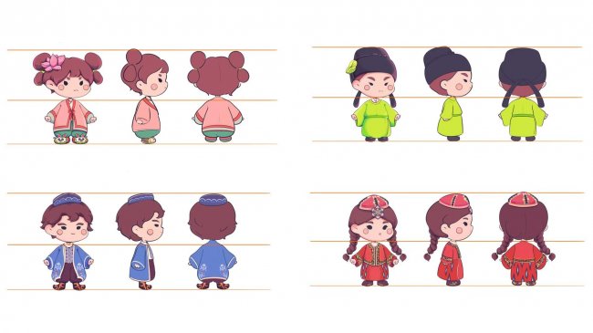 图为四大IP人物三视图(圆圆、江江、勤勤、莲莲)