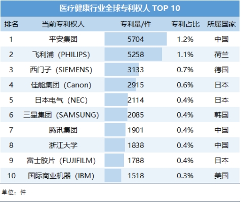 表2 医疗健康行业全球专利权人 TOP 10