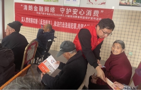 在2026年“3·15国际消费者权益日”来临之际,为切实提升老年群体的金融风险防范意识,平安产险宁海支公司于3月3日组织志愿者走进宁海县东南溪养老服务中心,开展以“清朗金融网络 守护安心消费”为主题的金融宣教活动。