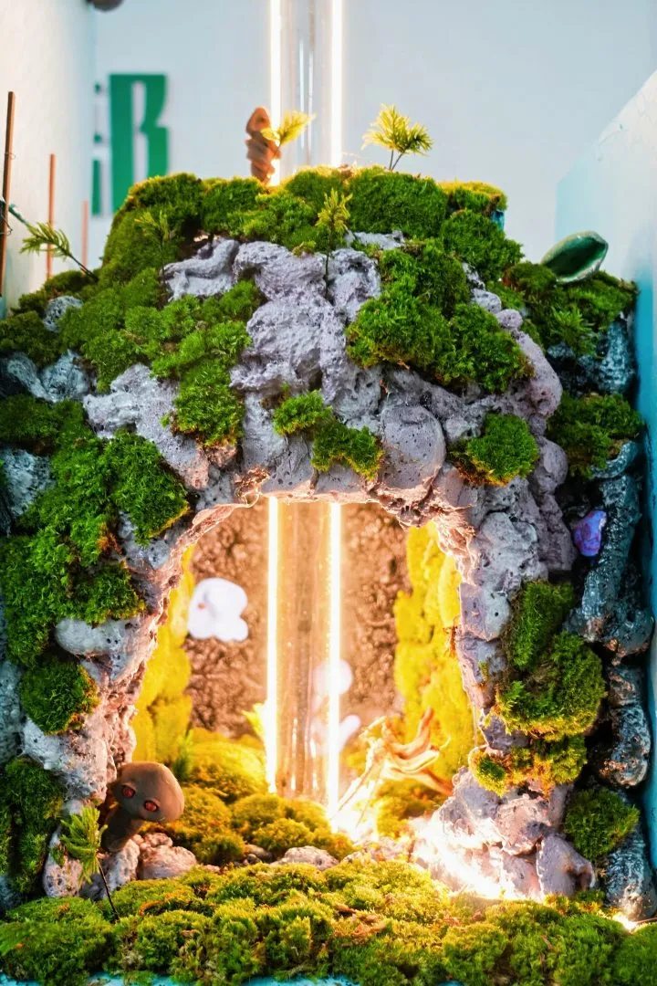 活动特别设置了艺术共创环节。工坊内部,创意团队以“荒芜之地,苔藓新生”为主题打造艺术装置,模拟出绿意生长的过程。