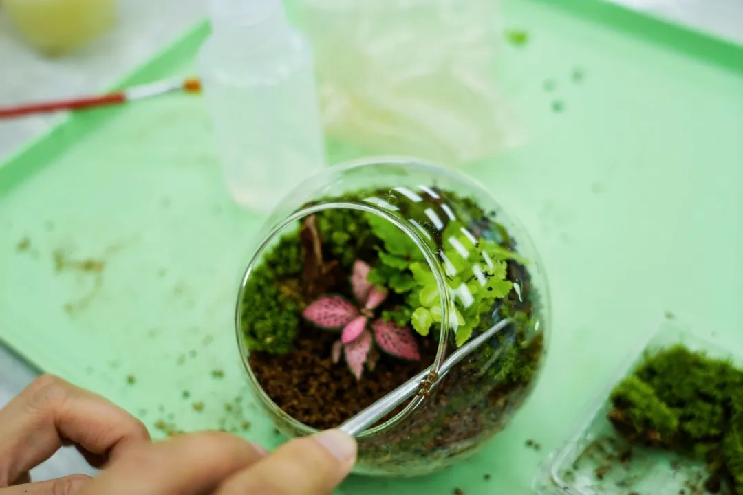 随后的生态瓶手作环节中,孩子们将苔藓、泥土、小石创意搭配,亲手打造出一个个会呼吸的“迷你森林”。研学过程中,孩子们不仅收获了知识,更在动手实践中体会到自然的奇妙与生命的韧性。